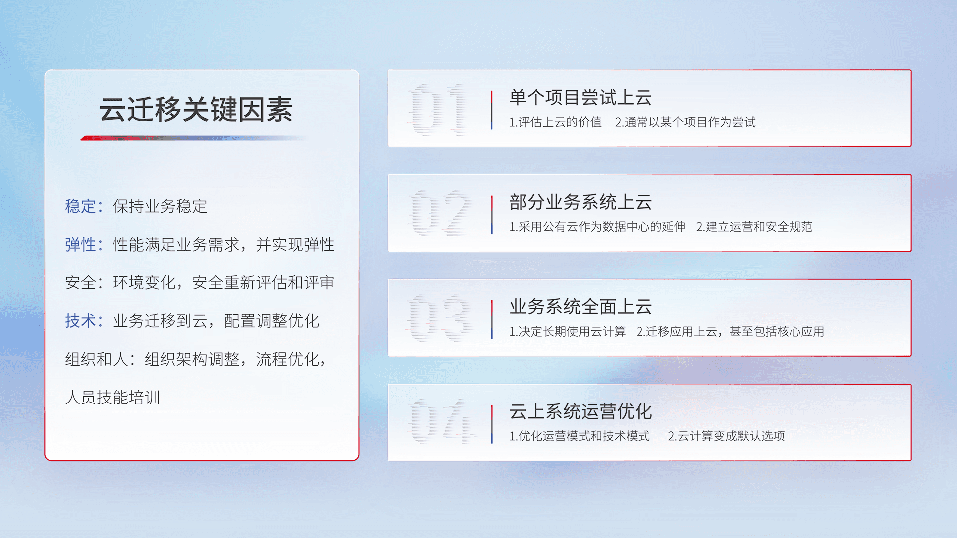 结合实际业务,,从规划设计、、、、云平台选型、、、、云原生改造、、数据迁移、、集成交付,,,,迁移全过程为客户识别最佳上云路径,,,,做好风险识别管理,,设计网络架构、、、、身份权限、、安全审计合规、、、、操作审计、、、日志审计、、监控告警策略、、、多站点容灾设计等,,,对云上基础设施进行整体规划,,,提升IT治理水平,,,以满足弹性、、高可用、、高性能的需求。。。